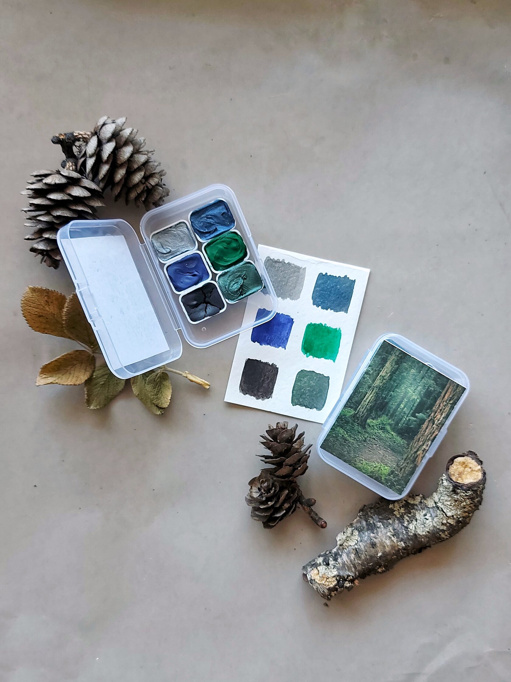 Палитра акварели ручной работы в сине-зелёной гамме "Тёмный лес "